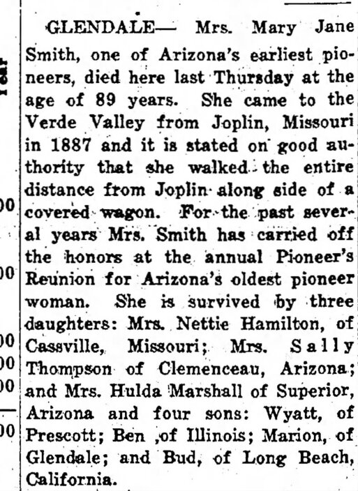 Mary Jane and Maurice Calvin Smith had four boys, and four girls. Bill Ed, Wyatt, Ben, and Maurice. Mittie, Julia, Sarah, and Hulda Susan. They joined a covered wagon train leaving Cedar County, Missouri, in April 1887, destination was the Verde Valley in Arizona, arriving in Flagstaff on the 4th of July.